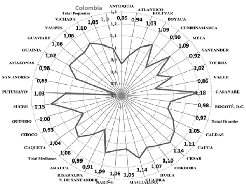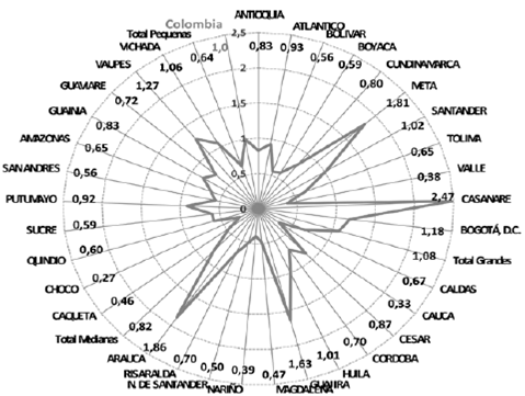 Las restricciones en la diversificación productiva regional colombiana que concentra en las economías principales los mayores niveles de producto, sigue siendo un obstáculo para que la postura fiscal de las pequeñas economías garantice un crecimiento de su PIB superior al de los grupos región intermedios y grandes, pues si bien el gasto público y la FBKF presentaron un aporte relativo mayor al de los otros dos grupos al igual como lo respalda la contribución del valor agregado de sus gobiernos, su participación en el comportamiento del PIB nacional sigue estando muy alejada como referente del crecimiento. Así mismo, se observa como para el periodo de estudio y teniendo como ‘Benchmark’ el gasto público total del gobierno en Colombia (1,0), la localización del gasto es mayor en las economías intermedias (1,08) y pequeñas (1,05) y por debajo de este en las economías principales (0,97) lo que refleja una asignación equivalente en promedio del gasto en todas las regiones, a excepción de Valle (0,86), Antioquia (0,86) y San Andrés (0,65), respectivamente que presentaron la menor postura fiscal geográfica (Ilustración 3).