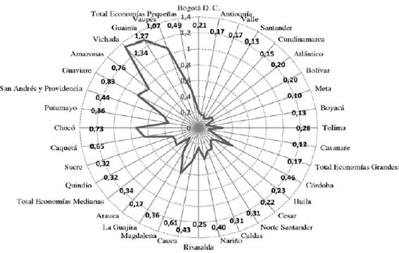 Economías pequeñas: Quindío, Sucre, Caquetá, Chocó, Putumayo, San Andrés y Providencia, Guaviare, Amazonas, Vichada, Guainía y Vaupés5.