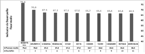 De los 33 departamentos (incluida Bogotá), se obser-va como las economías principales en su mayoría fueron las de mejor desempeño fiscal promedio a lo largo de la serie 2000-2013, siendo el Distrito Capital el mejor puntaje (76,6), seguido de Atlántico (70,0) y Cundinamarca (67,5); no obstante, Tolima (59,5) y Valle (58,8), adoptaron una postura fiscal insuficiente que los relegó a los últimos lugares del desempeño fiscal pese su tamaño (Ilustración 6). En las economías principales el mejor desempeño fiscal fue producto de mejoras sustanciales en el respaldo al servicio de la deuda, una progresiva menor dependencia de transferencias y regalías, la optimización de su capacidad de ahorro y principalmente por una mayor generación de recursos propios inducida por el tamaño de sus economías y la mayor diversificación productiva que les es propia cuyos gobiernos aprovecharon fiscalmente.