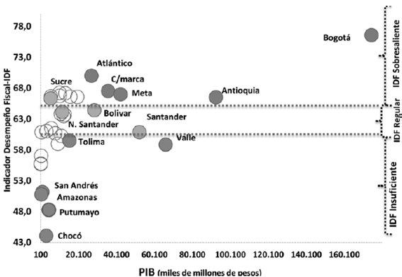 Por otra parte, la comparación de los resultados del PIB regional y su indicador de desempeño fiscal-IDF evidencia que típicamente la mayor parte de las economías grandes son las de mejor comportamiento en la ejecución, aun cuando este sea determinado por sus capacidades para generar ingresos propios, dado el tamaño y estructura de sus economías. Esta mayor autonomía fiscal, contrasta con la dependencia de transferencias y regalías en las pequeñas, las cuales permanecen supeditadas a los giros provistos desde el gobierno nacional central para atender compromisos condicionados de gasto, sobre los cuales no existe mayor margen fiscal discrecional.