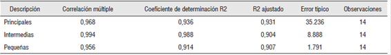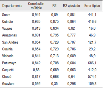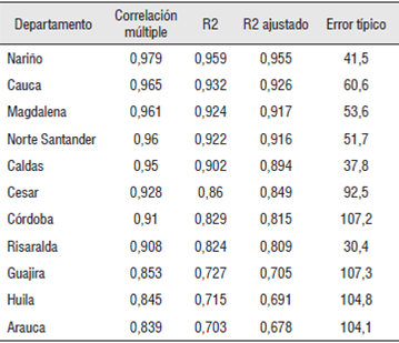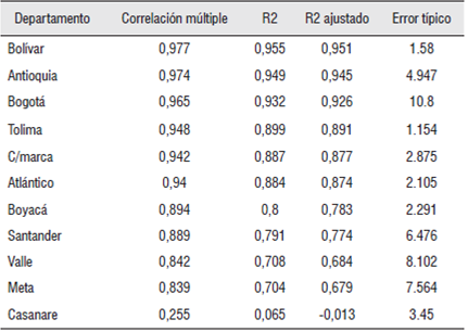 Los resultados muestran una incidencia importante del gasto público en el PIB de las economías principales, intermedias y pequeñas para el periodo de estudio (Tabla 1), medición que, para ser caracterizada, se efectuó también para cada uno de los departamentos que conforman cada grupo-región. Dicha relación resultó también ser significativa al analizar en cada caso y por separado la influencia de la inversión social, la formación bruta de capital y los gastos corrientes en la dinámica productiva correspondiente.