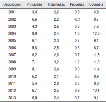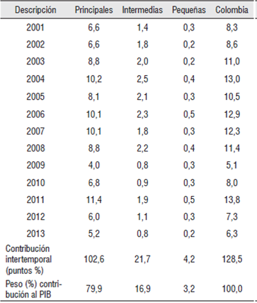 Las economías intermedias aportaron al PIB nacional el 16,9% de puntos porcentuales de crecimiento y su producto aumentó en promedio 9,2% a lo largo del periodo 2000-2013, algo menos que las economías principales. En este grupo-región puede así mismo apreciarse una significativa influencia del gasto público en el PIB, principalmente por los resultados presentados en Nariño, Cauca y Magdalena y aunque algo menor, Huila y Arauca (Tabla 4).