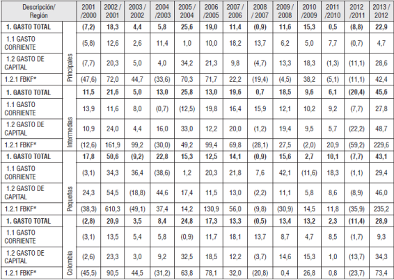 En estos resultados se destaca el comportamiento del gasto público total que creció 10,1% en promedio para el periodo 2000-2013 y 28,9% en el último año, aumentando en promedio en las economías pequeñas, intermedias y principales en 14,4%, 13,1% y 9,1%, respectivamente siendo el año 2013 en la mayoría de los casos, la vigencia con mayor ejecución fiscal en las regiones. De este componente, la formación bruta de capital fijo, referente de la inversión productiva y que impacta el crecimiento económico vía demanda, ha tenido un comportamiento irregular en los grupos-región aunque particularmente en los últimos años del periodo 2000-2013 se intensificó en las regiones, principalmente en las economías de menor tamaño (Tabla 6).