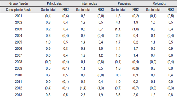Internalizando estos resultados, cabe destacar el salto que se propició en la dinámica del gasto público regional entre 2006-2007, que a nivel total presentó una asignación equivalente entre los grupos-región, ligeramente superior a la media nacional en las economías intermedias y pequeñas. Sin embargo, desde entonces se otorgan mayores cupos a la formación bruta de capital fijo que a las otras categorías de gasto, privilegiándolo sobre los indicadores de ejecución en funcionamiento, tal como lo sugiere Pinilla, et al. (2013) refiriendo los efectos detectados por Tanzi & Zee (1997), en el sentido que resulta mejor para el crecimiento económico controlar la composición del gasto público antes que su nivel.