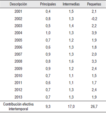 No obstante lo anterior, el PIB gubernamental de las economías principales pesa mucho más en el total del PIB del gobierno nacional (69,4%), que el de las pequeñas economías (8,1%) durante el periodo 2000-2013. En efecto, el valor agregado de los servicios del gobierno de las regiones más grandes aporta la mayor parte del crecimiento económico en el país en detrimento del aporte reducido que a este hacen las más pequeñas (Tabla 9).