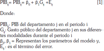 Con base en estos importantes precedentes y con el fin de determinar el impacto efectivo del gasto público en el crecimiento de los departamentos se adoptó una metodología con enfoque multimodal, cuya primera fase combina técnicas de MCO para identificar la relación existente entre el gasto y la inversión públicos con el crecimiento económico según los grupos de economías regionales constituidos. En tal sentido, se planteó un modelo que responde a la siguiente descripción: