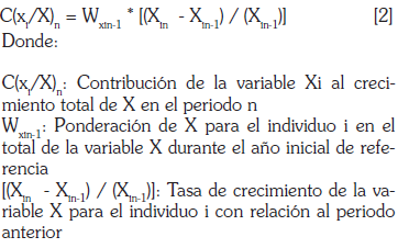 Este modelo fue aplicado a los resultados totales del gasto público y el PIB regional para los grupos-región, así como para cada uno de sus integrantes a fin de identificar el grado de asociación lineal existente entre las variables de análisis durante el periodo de estudio6. De otro lado, en la medida que el crecimiento de una variable, llámese X, puede expresarse como la suma de las contribuciones relativas de sus elementos constitutivos, estos aportes se obtienen como resultado del producto entre la ponderación de cada variable en el total agregado al que pertenece (calculado en el año anterior) y su variación porcentual, lo cual se expresa como: