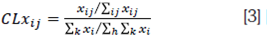 Xij, con (i=1,2,…h) identifica las variables económicas de interés (gasto, producto, público, formación bruta de capital fijo, etc.) en cada una de las regiones de análisis (j=1,2,…k) o departamentos; ∑ijXij representa el valor total del fenómeno Xi a analizar en el total en la región j; ∑k identifica el valor de la variable Xi en el total del país y ∑h∑k corresponde a total de la variable analizada Xi en el total del país.