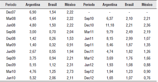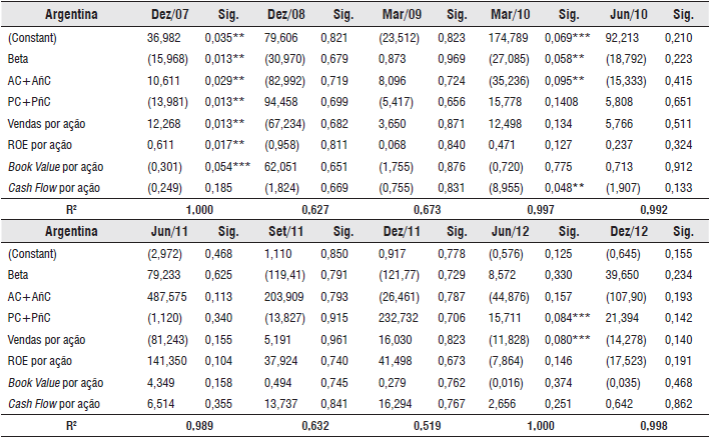 Com relação às empresas argentinas, pode-se observar, na Tabela 6, que a maioria das regressões representaram cerca de 84,24%, em média, da variação do retorno das ações das empresas argentinas. Dezembro de 2007 foi o período em que a maioria das variáveis do modelo foram significativas à 5%, sendo que somente o Crash flow por ação que não foi significativo. Ainda, no trimestre de março de 2010 houve duas variáveis significativas à 5%, que foram o Beta e o Ativo Total, e uma à 10%, tamanho; assim como no trimestre de junho de 2012 em que houve duas variáveis com significância à 10%, PC+PñC e vendas por ação. Nos outros períodos não houve significâncias das variáveis isoladamente para o modelo.