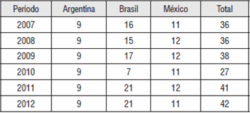 A escolha deste grupo deve-se ao fato de que as empresas que emitem ADR´s devem se enquadrar a padrões mais rígidos de Governança Corporativa, devendo apresentar em média melhor qualidade de Governança do que as outras de seu país de origem, conforme apresenta Silveira (2004). As empresas com tais características ficaram restritas aos países Argentina, Brasil e México pois representarem a maior parte das empresas latino americanas que emitiram ADRs, são os países que possuem a quantidade de dados disponíveis para a referida análise. Além disso, estes países estão correspondem as três maiores economias da América Latina. Justas foram responsáveis por 70% do PIB nominal da América Latina no ano de 2012 conforme dados do Banco Mundial (World Bank, 2014). Para a elaboração da análise foram excluídas as empresas que não possuíam todos os dados na base, para que permitissem as informações necessárias para sua análise.