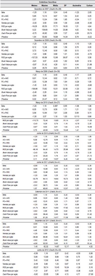As estatísticas descritivas para todas as baixas indicam características comuns. As distribuições da maioria das variáveis explicativas, exceto as distribuições o Beta, o PC+PñC, Vendas por ação, ROE por ação e Book Value por ação, tem assimetria positiva. O Beta tem assimetria negativa em todos as baixas de ações.