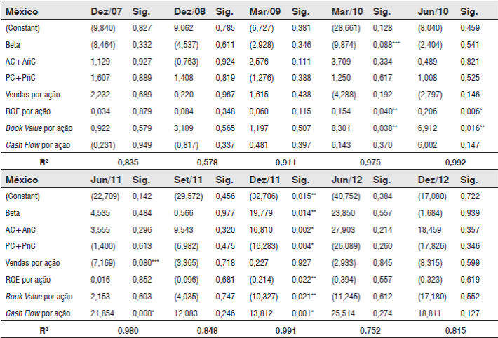 Ao se analisar os dados relacionados ao impacto financeiro no retorno das ações das empresas mexicana, por meio dos coeficientes de regressão nos períodos em que aconteceram as maiores baixas, pode-se observar, na Tabela 5, que a maioria das regressões representaram cerca de 86,77%, em média, da variação do retorno das ações das empresas mexicanas. No entanto, em dezembro de 2007, dezembro de 2008 e março de 2009, nenhuma das variáveis do modelo foram significativas para explicar as quedas nos retornos das ações. Ou seja, nesse período houveram outras variáveis que possam ter ocasionada a queda do preço das ações das empresas mexicanas.