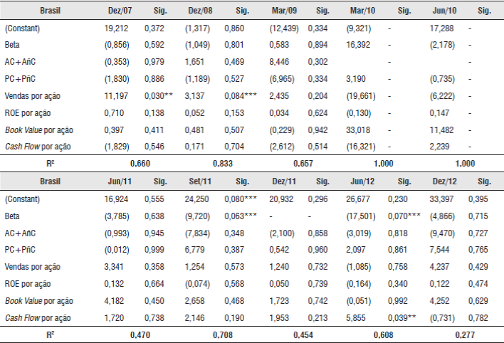 Em março de 2010 e junho de 2010, duas variáveis do estudo foram significativas para o modelo em 5%: o ROE por ação e o Book Value por ação. Já em dezembro de 2011, a maioria das variáveis apresentaram-se significativas à 1% e a 5% para o modelo, sendo que somente vendas por ação não foi significativo. Nos trimestres de março de 2012 e junho de 2011, duas variáveis foram significativas à 10% para o modelo, sendo o Beta e vendas por ações. Nos demais trimestres, não houveram variáveis significativas para o modelo.