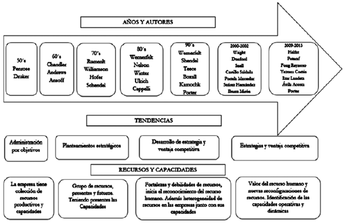 En la Ilustración 1 se observa que a través del tiempo, se le va dando una jerarquía a cada concepto dentro de la teoría de los recursos y capacidades. Por su parte a los recursos humanos, se le ha dado más importancia a partir del año 2000, en donde el auge está en las estrategias y en la ventaja competitiva.