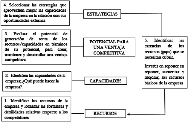 En la Ilustración 2 se destacan cuatro elementos importantes: recursos, capacidades, potencial para una ventaja competitiva sostenible y estrategia. Tanto los recursos como las capacidades, se reconocen previamente, para saber que puede crear u ofrecer las empresas, posteriormente se indica que hay que llevar a cabo una evaluación, referente al potencial de la generación de renta de los recursos y capacidades, para conocer las posibilidades que tiene la empresa para crear, mantener o incrementar una ventaja competitiva.