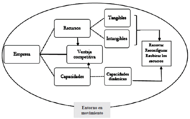 La teoría de recursos basada en las capacidades dinámicas (Teece & Pisano, 1994; Teece, Pisano & Shuen, 1997; Eisenhardt & Martin, 2000; Hoopes, Madsen & Walker, 2003), se refiere a que las capacidades son formuladas como activos intangibles complejos, los cuales deben ser únicos, raros, difíciles de imitar y sustituir, además que ayuden a potenciar la generación de renta. Lo que implica adaptación y cambio para integrar, construir y reconfigurar las competencias internas y externas, para hacer frente a ambientes cambiantes. Estas deben desarrollo de las capacidades de la organización a través del continuo cambio de los recursos intangibles estratégicos (Eisenhardt & Martin, 2000).