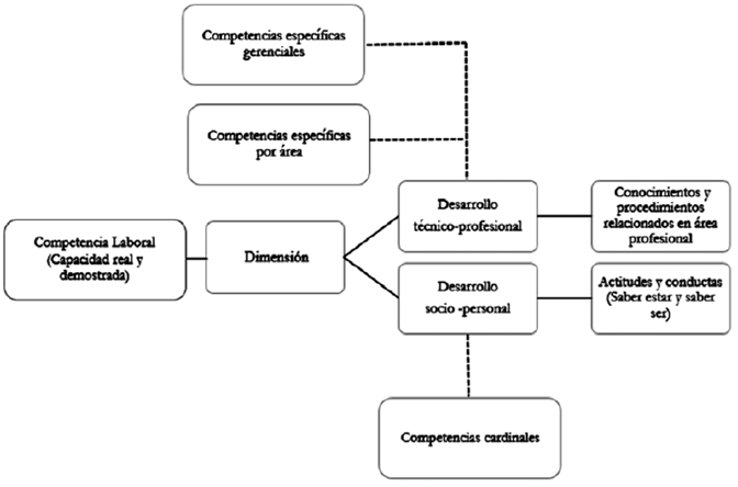 Pérez (2001) lleva a cabo una revisión con diferentes autores para conocer los tipos de competencias y encuentra que no hay denominación. Posteriormente se realiza un análisis comparativo, en el que se determina que hay dos dimensiones en las competencias: i) las de desarrollo técnico - profesional, y ii) de desarrollo socio - personal (Bisquerra & Pérez, 2007).