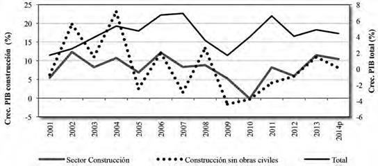 El estimuló al sector de la construcción ha sido uno de los puntos clave de la política de vivienda en Bogotá, siendo este sector uno de los principales indicadores de la actividad económica en el corto plazo. Sin embargo, esto no significa necesariamente que la política de vivienda genere grandes impactos en el resto de la economía, pues sin incluir obras civiles, la construcción representaba en 2014 tan sólo el 5,3% del PIB; probablemente, de lo que se trata, es de un sector altamente vinculado a los vaivenes de la demanda agregada. El reconocimiento de este hecho toma validez al observar la estrecha relación entre el comportamiento del mercado de vivienda y el del PIB total de la economía (Ilustración 1).