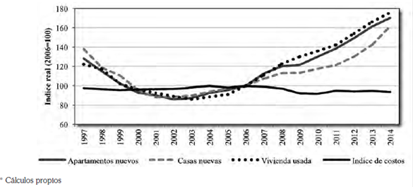El mercado de la vivienda tiene la particularidad de presentar una oferta limitada, siendo el suelo su principal componente, de forma que se puede hablar de una oferta inelástica. Solamente cambios estructurales en la disponibilidad del suelo o legislación territorial podrían afectar las condiciones de mercado desde la oferta, sin embargo, esto no parece ser lo ocurrido en los últimos años. En ese orden de ideas, la evolución de los precios es atribuible principalmente a las condiciones de demanda o a posibles comportamientos especulativos en el sector. La Ilustración 2 ilustra la evolución del índice de precios de apartamentos nuevos, el índice de precios de casas nuevas, el índice de precios de vivienda usada (casas y apartamentos) y el índice de costos de construcción de vivienda ; cada uno de ellos calculado en términos reales (aislando la inflación del resto de la economía). A pesar de la relativa estabilidad de los costos de construcción durante la última década y media, los precios han crecido significativamente desde el año 2004. Esta evolución sugiere un posible exceso de demanda de vivienda durante dicho periodo.