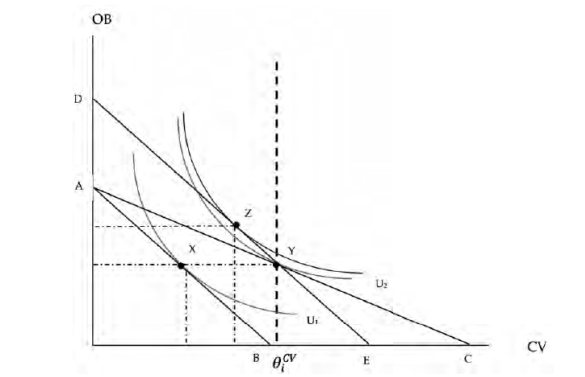 Como se observa en la Ilustración 3, aunque los subsidios condicionados habituales generan un efecto ingreso que podría incrementar la demanda de otros bienes, sus efectos distorsionan las decisiones óptimas de los agentes, modificando los precios relativos de mercado y generando ineficiencias en la asignación. Al pasar de la cesta X a la cesta Y los hogares mejoran su bienestar de U1 a U2 y logran consumir un nivel mínimo de vivienda que se considera de subsistencia (θ1CV ), sin embargo, existe un efecto sustitución que conlleva a que este resultado no sea óptimo. Nótese que bajo los precios iniciales, el presupuesto utilizado para conseguir la cesta Y es equivalente al que permite obtener la cesta Z, la cual genera mayor bienestar al hogar; esto significa que las distorsiones generadas sobre los precios tienden a sesgar las decisiones de consumo sobrevalorando la importancia del consumo de vivienda.