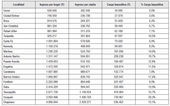 Para efectos e ilustración, la tabla 1 presenta el ingreso por hogar, según localidad, el ingreso per cápita, la carga impositiva y la participación de dicha carga sobre el ingreso. Se observa que la localidad de Usme presentaba el ingreso promedio por hogar más bajo, mientras que Chapinero presentaba el más alto; en cuanto a la carga impositiva, como participación del ingreso, Cuidad Bolívar presenta la baja y Usaquén la más alta.