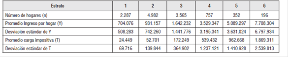Para las dos variables utilizadas en las estimaciones, a saber, ingreso por hogar (Y) y carga impositiva (T), se presentan las estadísticas descriptivas básicas en la tabla 2. Se evidencian diferencias significativas en los hogares entre estratos y al interior de estos. Las desviaciones estándar dan luces de la heterogeneidad de los estratos, especialmente en lo referente a la carga impositiva que los hogares manifestaron en la encuesta.
