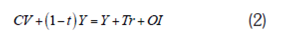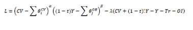 Donde el lado izquierdo de la ecuación (2) representa el gasto total de un individuo representativo, el cual se descompone en consumo de vivienda (CV) y gasto en otros bienes ((1-t)Y) . El lado derecho representa la fuente de ingresos de un individuo representativo, los cuales se componen por los ingresos totales Y(producto de su trabajo o renta corrientes), las transferencias o subsidios recibidos por el gobierno (Tr) y otros ingresos (OI) que pueden ser resultado de deuda adquirida por el individuo representativo o por ingresos extraordinarios como donaciones.