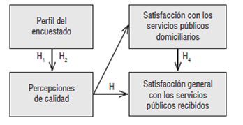 A partir del esquema propuesto por Vergara-Schmalbach, Quesada & Blanco (2012), se estructura el siguiente modelo teórico para valorar las percepciones de calidad y satisfacción de los servicios domiciliarios -energía, acueducto y alcantarillado, telefonía, internet y gas natural en la ciudad de Cartagena, incluyendo elementos del perfil del encuestado y el nivel de satisfacción general, con el fin de enriquecer el análisis causal.