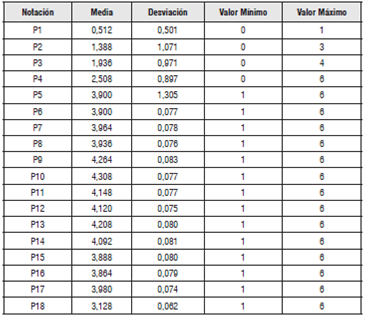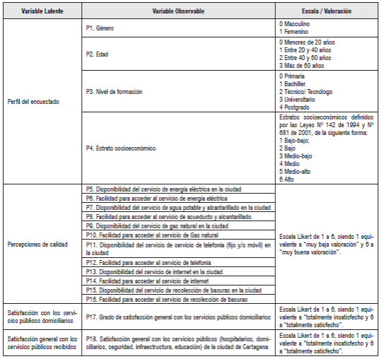 Para evaluar las variables latentes presentes en el modelo propuesto, se determinaron una serie de variables observables o medibles -identificadas de P1 a P18-, que se ajustaron al diseño de un cuestionario compuesto por 18 ítems. Por ejemplo, la variable latente denominada como perfil del encuestado, le corresponden cuatro variables observables: género, edad, nivel de formación y estrato socioeconómico. La Tabla 1 muestra las variables empleadas en el modelo, con sus respectivas escalas de valores.