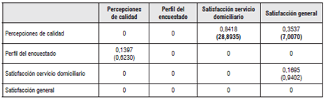 El diseño estructural fue analizado con la ayuda del software SmartPLS 2.0 (Ringle, Wende & Will, 2005), que emplea el método PLS-PM, un algoritmo que permite estimar los coeficientes del modelo (Esposito, Trinchera & Amato, 2010). Los resultados sugieren dos correlaciones fuertes entre las percepciones de calidad y las satisfacción con los servicios domiciliarios, y las percepciones y la satisfacción general, esta última relacionada con la valoración de todos los servicios públicos recibidos -domiciliarios, salud, educación, seguridad, infraestructura y buen gobierno-. Estas correlaciones indican la aceptación de sólo dos hipótesis (H2 y H3), de las 4 planteadas en el modelo estructural. En la Tabla 3 se muestran las correlaciones respectivas y los valores t (entre paréntesis), cuya aceptación se alcanza cuando t>1,96, para un nivel de confianza del 95%.