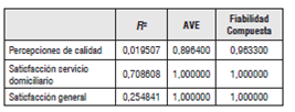 Las covarianzas explicadas (R^2) de las variables latentes dependientes -Tabla 4-, indican un nivel de análisis agregado aceptable para la satisfacción sobre los servicios públicos domiciliarios, explicando su variación en un 70,86% por las percepciones de calidad que, a su vez, no es afectada de forma significativa por el perfil de los encuestados -13,97%, según se aprecia en la Tabla 3. Asimismo, el modelo demuestra una validez discriminante y homogeneidad, representada por unos valores de la Varianza Extraída Media de las variables latentes -indicador que explica en qué proporción la varianza de una variable latente es afectada por las variables observadas superiores a las correlaciones obtenidas entre ellas mismas (Levy & Varela, 2006), y una Fiabilidad compuesta -que mide la consistencia interna de las variables observables por cada variable latente- superior a 0,7 (Esposito, Trinchera & Amato, 2010).