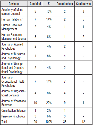 Es importante destacar que de los artículos identificados se seleccionaron solo aquellos que tenían la particularidad de contener las palabras utilizadas para la búsqueda en el título, abstract o palabras claves. Asimismo, para que el trabajo fuera incluido en esta revisión, el objetivo del mismo debía estar relacionado con el logro del equilibrio trabajo-vida o la mejora de la calidad de vida desde una perspectiva individual o, alternativamente, vincular teorías sobre estrategias individuales con otras variables individuales u organizacionales. Una vez finalizado el proceso de búsqueda, los estudios empíricos resultantes, y que cumplían con las condiciones de límite anteriormente establecidas, fueron 50. En la Tabla 1 se puede observar la cantidad de trabajos identificados de cada revista, como también el enfoque metodológico de las investigaciones empíricas seleccionadas (38 trabajos cuantitativos y 12 cualitativos).