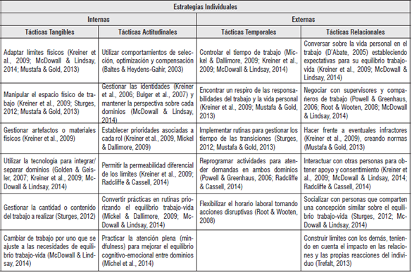 La revisión de las investigaciones empíricas permite identificar dos grandes dimensiones de estrategias individuales para la gestión del equilibrio trabajo - vida. Estas dimensiones surgen del análisis de las diferentes clasificaciones desarrolladas por los distintos autores con sustento en los enfoques teóricos mencionados en el apartado anterior. Estas dimensiones están vinculadas a la formulación e implementación de la estrategia, de modo tal que, si una estrategia se diseña y se ejecuta exclusivamente por el individuo, se la incluye dentro de la dimensión de estrategias internas. En contraposición, si para ello se requiere la aprobación o la colaboración de terceros (p. ej., organización, compañeros de trabajo, familiares, amigos), se considera a esta dimensión como estrategias externas. Cabe destacar que cada una de estas dos estrategias se encuentra compuesta por tácticas específicas que permiten llevarlas a la práctica. Es decir, cada conjunto de tácticas específicas se relaciona con una dimensión estratégica en particular. A continuación, se desarrollan las categorías de tácticas identificadas dentro de cada dimensión estratégica.