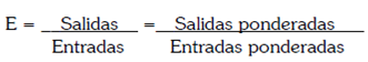 Donde E representa la eficiencia, xi, y yi son las entradas y salidas respectivamente, mientras que los parámetros uiy vi muestran las importancias relativas de cada uno de los parámetros.