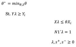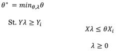 Donde θ indica la distancia en inputs a la envolvente de datos, es decir la medida de eficiencia. X es la matriz de inputs, Y es la matriz de outputs, λ es el vector de pesos o intensidades, representan los valores de inputs y outputs respectivamente (Delfín & Navarro, 2014).