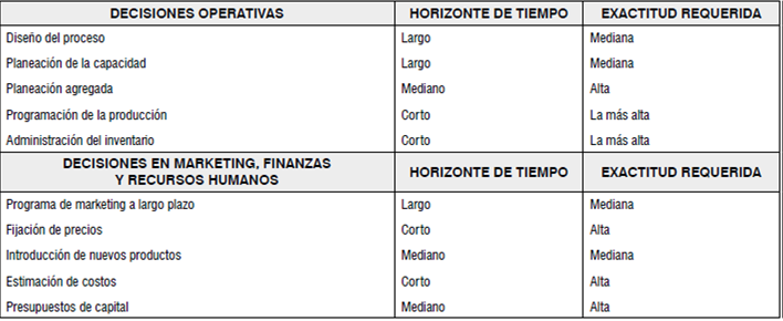 Los pronósticos en las organizaciones según Schroeder, Meyer & Rungtusanatham (2011) van desde decisiones operativas hasta las relacionadas con marketing, finanzas y recursos humanos (tabla 1).