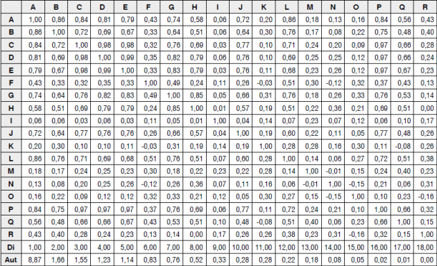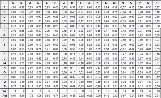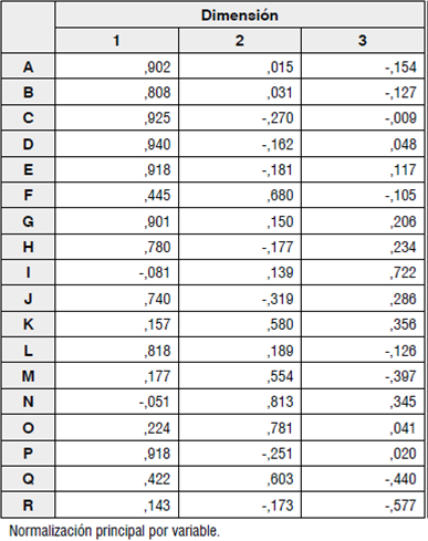 Para identificar las dimensiones y las variables críticas que harán parte del sistema multidimensional de pronósticos en las pymes industriales de Ibagué, se emplearon los métodos de componentes principales (PC), máxima verosimilitud (ML) asumiendo variables cuantitativas (García, 2011; Marquina, et al., 2014; Pérez, et al., 2013) numéricas (Lafuente y Poza, 2012), no métricas codificadas (Hair et al., 1999) y discretas y/o ordinales (Martín et al., 2008); Así mismo se aplicaron los modelos de componentes principales no lineales o categóricos (CatPCA) (Pérez, 2009; Tapia, 2007; Morales, 2004) y el análisis factorial de correspondencias múltiples (ACM). La pertinencia de los modelos PC y ML se demuestra con las pruebas de esfericidad de Barlett con base en sus estadísticos KMO que son altos y p-valores muy pequeños (Guisande, Vaamonde y Barreiro, 2011; Pérez, 2009) (ver tablas 9 y 10) y para el caso del ACM y CatPCA con las matrices de correlaciones que se muestran en las tablas 11 y 12.