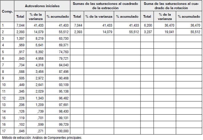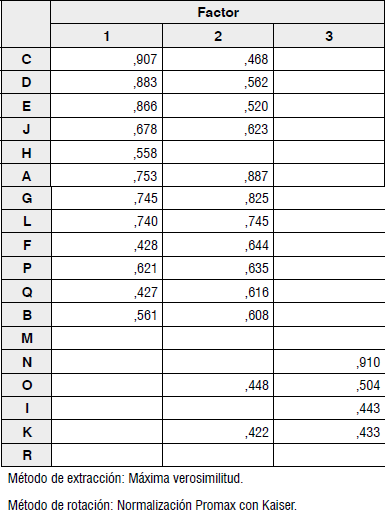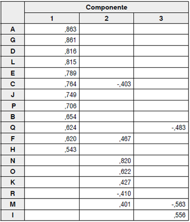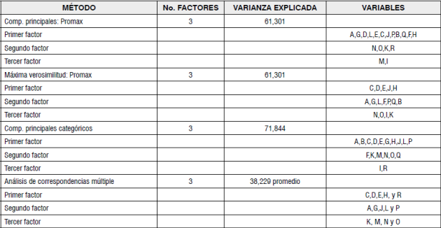 En una segunda etapa se aplicó el análisis factorial (AF) que es una de las técnicas del análisis multivariado y que se ha convertido en una herramienta de gran importancia en campos como la industria, el gobierno, centros universitarios y de investigación (De la Garza, Morales & González, 2013; Hair, Anderson, Tatham & Black, 1999). El AF permite identificar las variables subyacentes que expliquen las correlaciones dentro de cada conjunto de atributos observados (Ferrán, 2001; Hair et al., 1999; De la Garza et al., 2013; Martín, Cabero & de Paz, 2008; Pérez, 2009; Quezada, 2012).