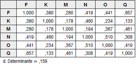Con relación a la validez que analiza el grado en que un instrumento mide la variable que pretende medir (Hernández et. al., 2010; Ghauri & Gronhaug, 2010; Corbetta, 2007), se realizó la validez de contenido a través una revisión exhaustiva de literatura y una muestra piloto a 4 pymes para garantizar que el test constituyera una muestra representativa de los contenidos que pretendía evaluar (Nunally, 1978). Sobre la validez de constructo y en particular con la validez convergente se calculó la matriz de correlaciones entre las diferentes dimensiones del cuestionario (ver tabla 5) y se observa por su determinante (1,94E-006) que las variables están bastante correlacionadas, lo cual coincide con las correlaciones de los factores de planeación y organización de los pronósticos (ver tabla 6) y dirección de los pronósticos (ver tabla 7) que corroboran la existencia de validez discriminante.