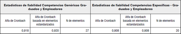 Se utilizó un instrumento con una escala Likert de 4, donde 1 es nada importante y 4 es bastante importante, que se construyó y aplicó en el proyecto Tuning Latinoamérica, el cual en su momento fue validado por expertos de los diferentes países participantes; además en ASCOLFA-GRIICA (2010) este instrumento fue revisado y validado por docentes de diferentes capítulos. En este trabajo se realizó la validación interna del instrumento con el Alfa de Crombach que se aplicó a los 20 ítems utilizados en las competencias específicas y a los 27 ítems utilizados en las competencias genéricas que se indagaron con egresados y empleadores. En las competencias Genéricas y Específicas se observa un Alfa de Crombach del 92% y 91% respectivamente el cual es el límite inferior de la verdadera fiabilidad del cuestionario. El criterio para definir si este valor del estadístico es aceptable es el siguiente: Si Alfa de Crombach > 0.9 es excelente; Alfa de Crombach>0.8 es bueno; Alfa de Crombach > 0.7 es aceptable; Alfa de Crombach > 0.6 es cuestionable; Alfa de Crombach> 0.5 es pobre. Luego es excelente la fiabilidad de los dos instrumentos (ver tabla 1).