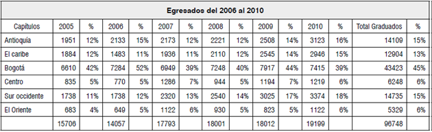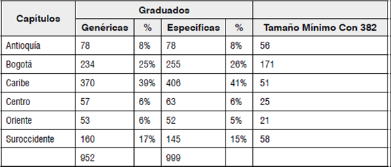 Como el número de graduados de los 101 programas vinculados a ASCOLFA es mucho menor al total del Ministerio de Educación Nacional de Colombia-MEN (ver tabla 2) dado que no todos los programas están en ASCOFA, podemos concluir que la muestra es suficientemente grande y representativa; supera el tamaño mínimo de cada capítulo correspondiente al tamaño muestral recomendado de 382 graduados. Se utilizó el porcentaje de graduados totales suministrado por el ministerio de educación.