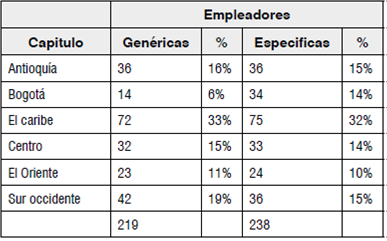 Para el caso de empleadores fue mucho más difícil definir el tamaño poblacional, luego se partió del supuesto de población infinita: Para P= 0,08; Zα = 1,96; ϵ = 0,05 y (1-α)=0,95 se tienen una muestra de nα = 150. Aplicando la condición para definir si esta muestra es correcta se tiene que: N>150(150-1)=22.350; teniendo en cuenta lo reportado por el observatorio laboral, donde hacen referencia a una población de 40.230, esto para 12 ciudades: Medellín, Barranquilla, Cartagena, Manizales, Montería, Villavicencio, Pasto, Cúcuta, Armenia, Bucaramanga, Ibagué, Cali y Bogotá (MEN, 2008-2013), podemos afirmar con base en esto que el tamaño muestral mínimo para nosotros es de 150 empleadores y está bien el supuesto de población infinita. Se trabajó con una muestra de 219 y 238 empleadores para genéricas y especificas respectivamente (ver tabla 4), luego es representativa la muestra tomada.