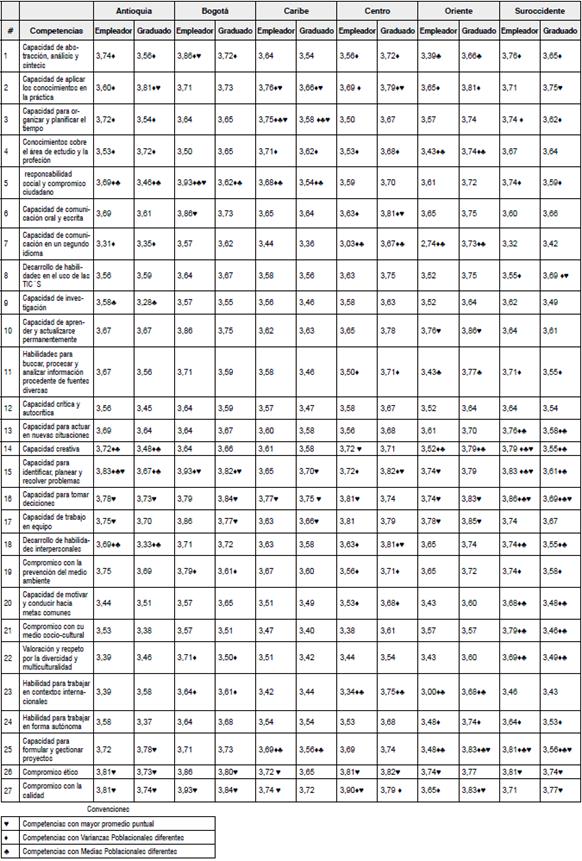 ; para las competencias con un P-valor, menor al 5% es significativa la diferencia de medias poblacionales, (en las tablas 5 y 6 se identifican con trébol ♣) y con el apoyo del intervalo de confianza se identificaron las competencias que presentaban una mayor importancia para graduados o empleadores. El promedio de importancia puntual asociado en cada grupo a cada una de las competencias (genéricas y específicas) por región geográfica se observa en las tablas 5 y 6 respectivamente. Las identificadas con corazones (♥) son las cinco competencias con mayor importancia puntual por grupo. Dichas tablas resumen los resultados de las pruebas estadísticas que se han descrito para las competencias genéricas y específicas en cada región geográfica seleccionada: Antioquia, Bogotá, Caribe, Centro, Oriente y Suroccidente.
