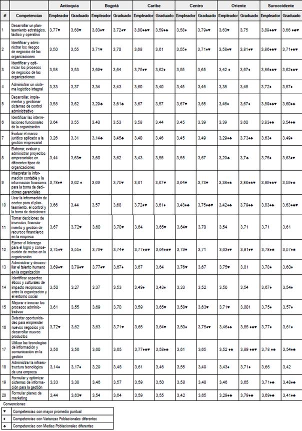 Como se observa en las seis regiones, Antioquia, Oriente y Suroccidente coinciden con el 50% de las cinco competencias específicas y cinco genéricas más importantes solicitadas para ser el empleado. Es importante resaltar que el promedio de importancia asociado por empleadores y egresados no es diferente en la mayoría de las competencias, pero no están en el mismo orden. Bogotá y Caribe solo coinciden en el 40% y en el Centro solo coinciden en el 20%. Esto no indica que las competencias importantes para los empleadores no lo son para graduados, hay otras que estos ven más relevantes. Los graduados están más inclinados a los nuevos negocios y productos así como en la diversificación de los negocios, se muestran como una generación más emprendedora. En el Suroccidente y Centro a los egresados también les preocupa el riesgo de los negocios. Destacan como coincidentes en las competencias genéricas de esta investigación y de la revisión de la literatura: capacidad para identificar, planear y resolver problemas, capacidad para tomar decisiones y compromiso ético.