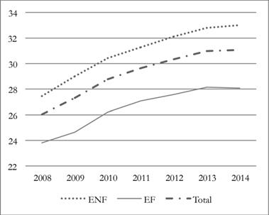 Desde la entrada en vigencia del Código País en 2007, muchas empresas en Colombia se han comprometido con la implementación de buenas prácticas de gobierno. Esta situación se evidencia en el Gráfico 1, donde se muestra que durante el period 2008-2014 las empresas han mejorado en las mediciones promedio, tanto EF como ENF presentan mejores mediciones cada año.