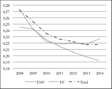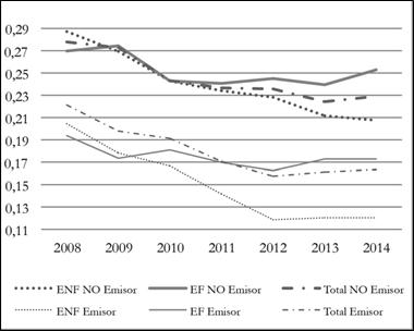 El coeficiente de variación en ENF NO Emisores se reduce de 0.287 en 2008 a 0.207 en 2014 (8 puntos porcentuales), en tanto que en los ENF Emisores la reducción es de 8.4 puntos porcentuales, en este último grupo el coeficiente de variación pasa de 0.204 a 0.120. Respecto a las EF se encuentra que en las EF NO Emisores la dispersión es mayor que en las EF Emisores, no obstante, la reducción en la dispersión es similar en los dos grupos. En las EF NO Emisores la dispersión pasa de 0.269 en 2008 a 0.253 en 2014 (reducción de 1.7 puntos porcentuales). En tanto que en las EF Emisores la dispersión se mantiene en niveles estables, luego de pequeños cambios en el periodo de estudio, en 2008 la dispersión era de 0.194 y termina en 2014 con 0.173 (reducción de 2.1 puntos porcentuales). En el gráfico 3 se resume el comportamiento del coeficiente de variación.