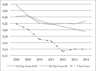 El coeficiente de variación se reduce en 7.9 puntos porcentuales en las Top Ventas entre 2008 y 2014. En las ENF NO Top Ventas la reducción es de 8.3 puntos porcentuales, en tanto que en las EF NO Top Ventas la reducción es tan solo de 1.5 puntos porcentuales.