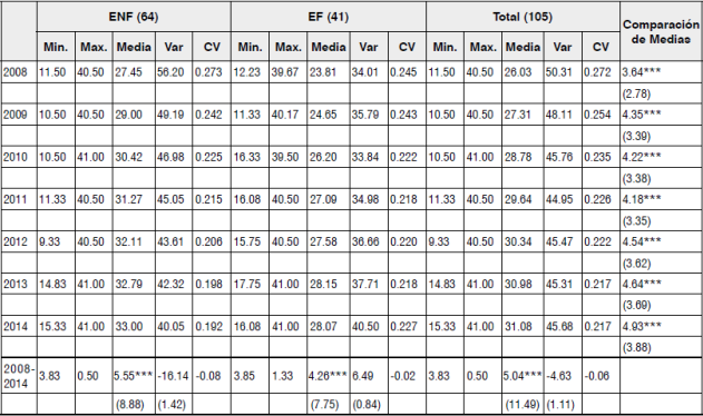 Se evidencia que las ENF tienen mejores estándares de gobierno corporativo, la prueba t muestra que la diferencia de medias entre ENF y EF es significativa para todos los años del estudio, esta diferencia tiende a ampliarse cada año. En el 2008 la diferencia promedio de la medición era de 3.64, para 2014 esta diferencia crece a 4.96. Los resultados son diferentes de acuerdo al carácter familiar, esto puede indicar que en las EF la adopción de nuevas prácticas de gobierno corporativo es un proceso que se hace a menor ritmo.
