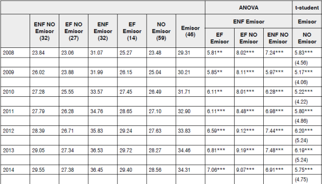 Los resultados muestran que no existen diferencias significativas entre EF Emisor, ENF NO Emisor y EF NO Emisor (en cualquiera de sus combinaciones). En tanto que las ENF Emisores se diferencian de estos tres grupos anteriores, las ENF Emisores presentan los mayores estándares de gobierno corporativo siendo significativas las diferencias en todos los años del estudio. Se destaca que las mayores diferencias se presentan con las EF NO Emisores, con este grupo la diferencia era de 8.02 unidades en 2008 y para 2014 crece a 9.07. En comparación con las EF Emisores, la diferencia también aumenta al final del estudio, pasa de 5.81 en 2008 a 7.06 en 2014. Frente a las ENF NO Emisores la diferencia presenta comportamientos inestables, en 2008 era de 7.24 y finaliza con 6.91 en 2014.