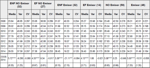 Respecto a la varianza, en la fila 2008-2014 de la tabla 3 se compara la varianza en 2008 con la encontrada al final del estudio. Se encuentra que en los Emisores se reduce en 10.514 unidades y en los NO Emisores aumenta 0.253 unidades, sin embargo, ninguno de estos cambios es significativo. Comparando con los dos criterios (Emisor, Familiar) se tiene que las ENF Emisores son el grupo que más reduce la dispersión, la varianza se reduce en 21.11 unidades siendo el único grupo donde la reducción en la dispersión es significativa (a nivel del 5%). En los EF NO Emisores la dispersión aumenta en 9.34, en las EF Emisores aumenta 1.88 y en las ENF NO Emisores se reduce 9.28 unidades.